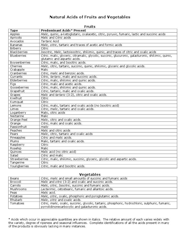 Food Acidity Acid Content Of Various Fruits And Vegetables And