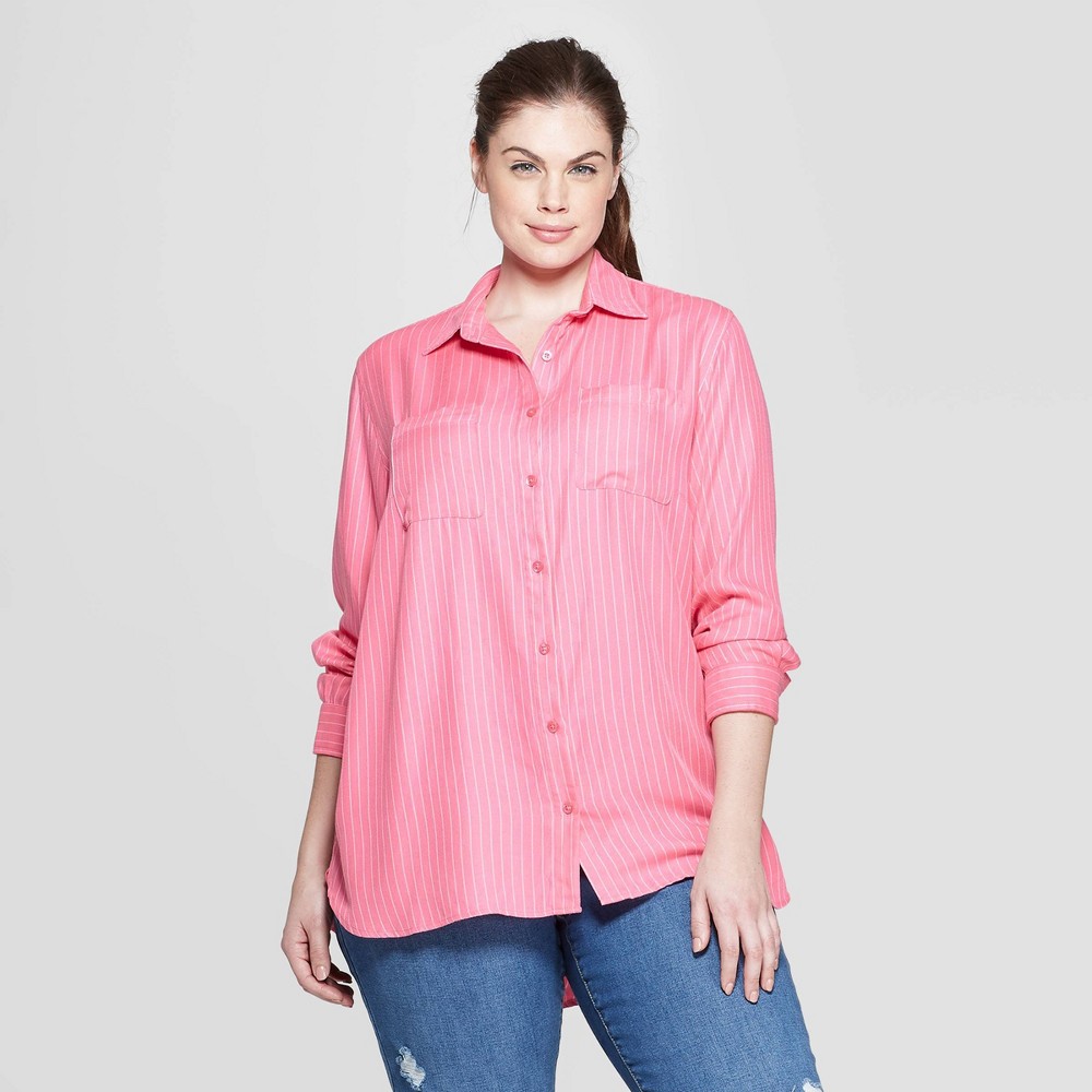 Womens Plus Size Striped Long Sleeve Collared Button Down Shirt