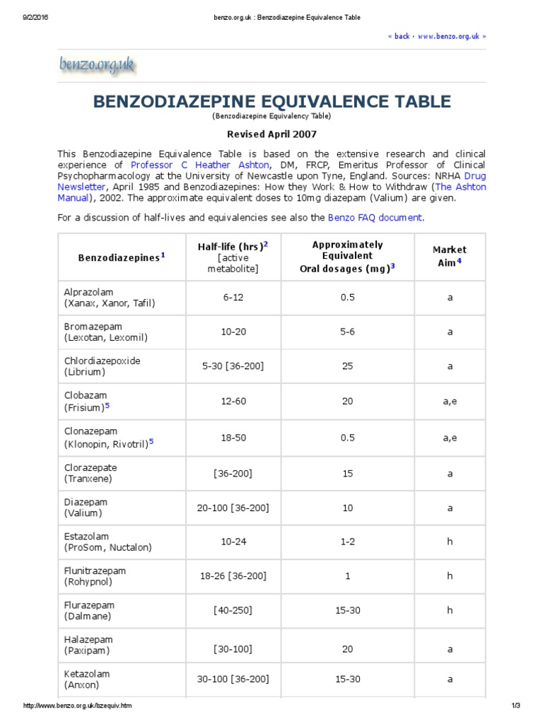 Benzodiazepine Equivalency Chart Benzodiazepine Equivalency