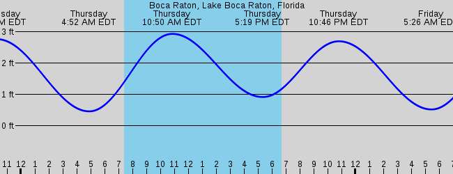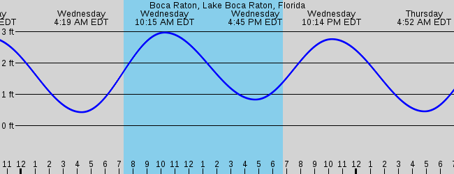 Know the tides and the tidal coefficient in boca raton lake boca raton for the next few days. Tide times are edt utc 4 0hrs. Click here to see boca raton s tide chart for the week.