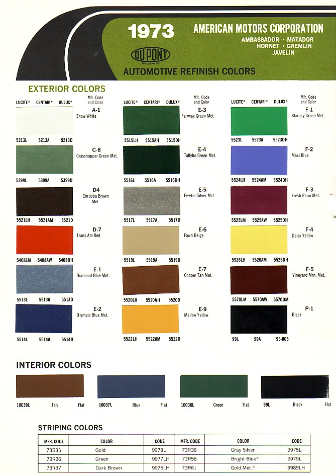 1970 American Motors Dupont Automotive Refinish Color Paint Chart