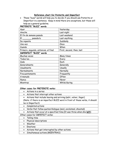Preterite Vs Imperfect Reference Chart And Buzz Words List