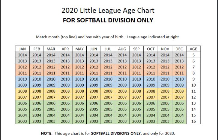 2020 Softball League Age Chart