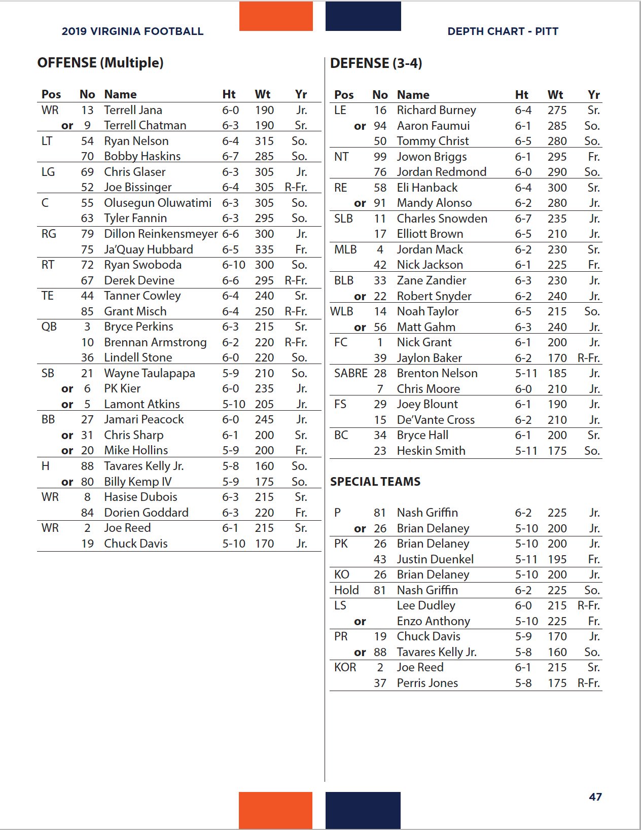 Virginia Football Depth Chart Update Pittsburgh Panthers Game