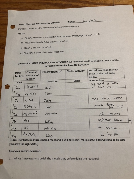 Solved Name Report Sheet Lab 15 Reactivity Of Metals P Chegg Com