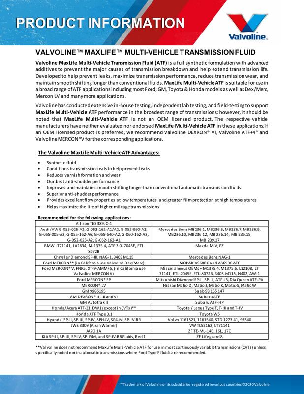 Valvoline Maxlife Dex Merc Automatic Transmission Fluid 1gal