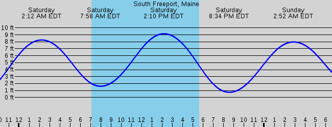 2020 08 04 tue 4 19 pm edt. The tide charts below show the height time and date of high and low tides for the next 30 days. South freeport casco bay maine 43 8200 n 70 1033 w 2020 08 04 tue 6 38 pm edt 0 6 feet low tide 2020 08 04 tue 7 59 pm edt sunset 2020 08 04 tue 9 00 pm edt moonrise 2020 08 05 wed 12 54 am edt 10 3 feet high tide 2020 08 05 wed 5 34 am edt.
