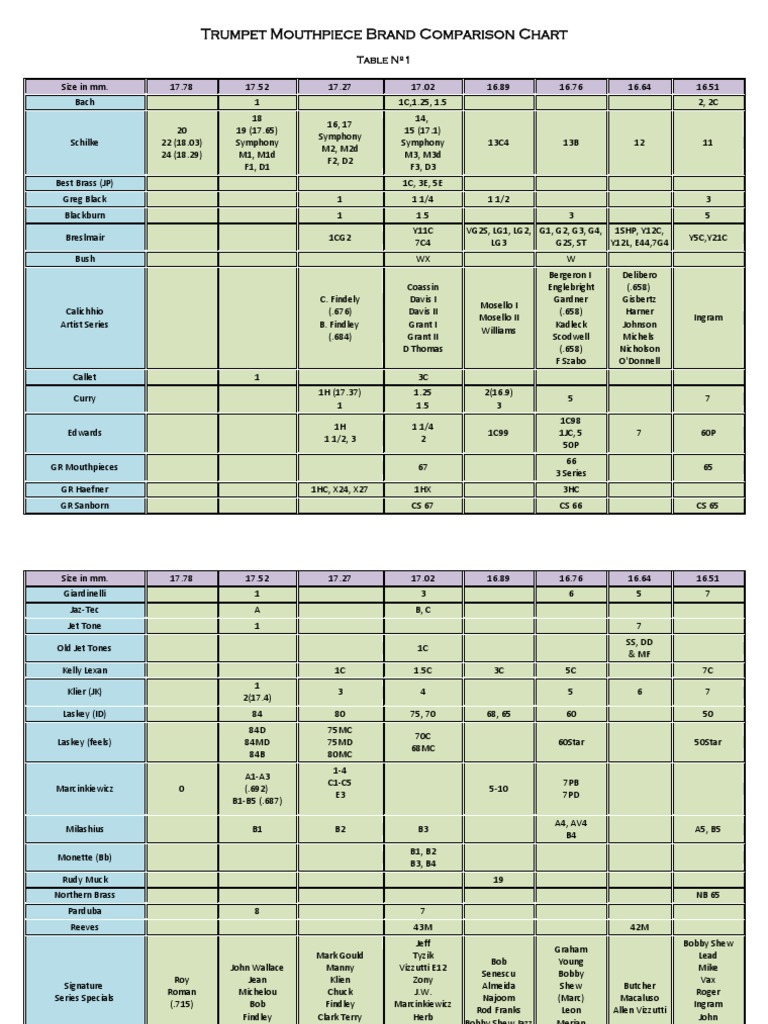 Http Www Trumpetworx Com Wp Content Uploads 2016 05 Benny Davis Trumpet Studio Trumpet Mouthpiece Brand Comparison Chart Pdf